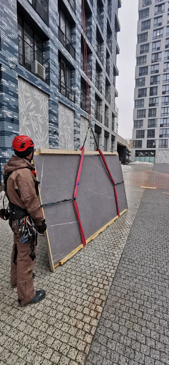 Подъём плит керамогранита осуществлялся с применением специального грузоподъёмного оборудования и систем канатного доступа.