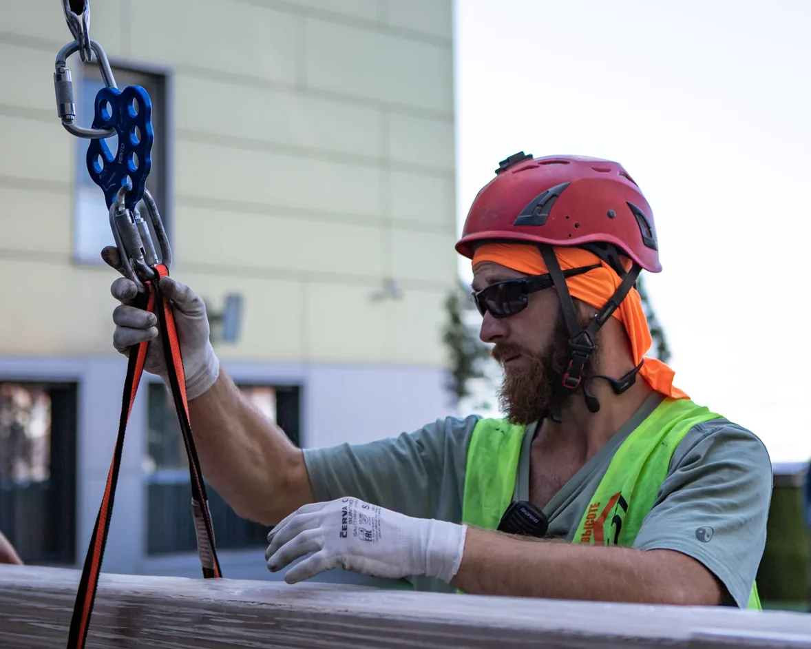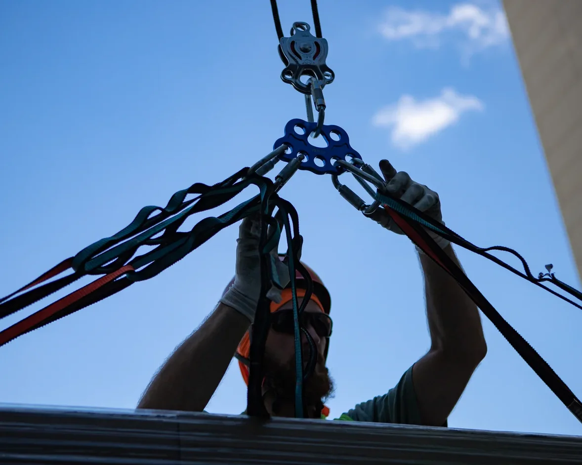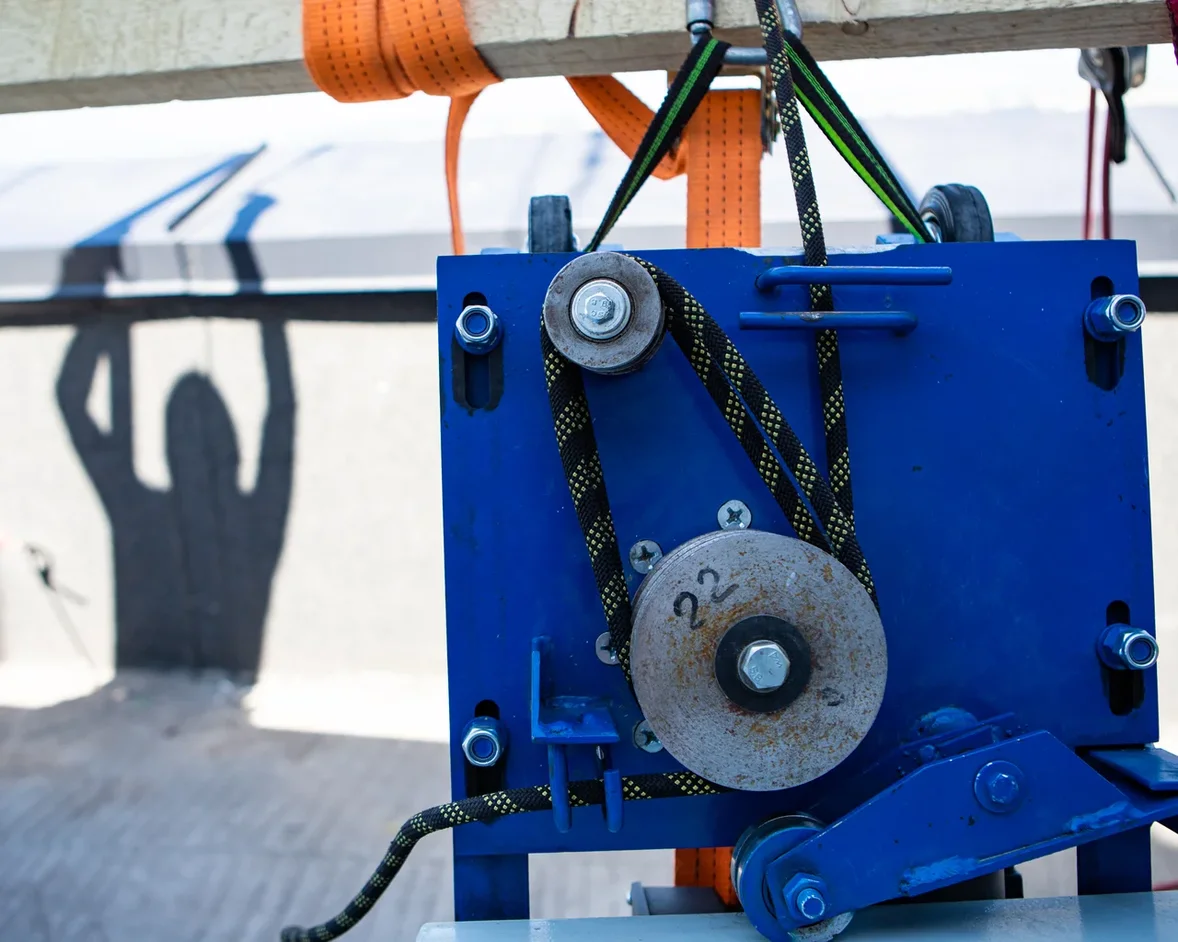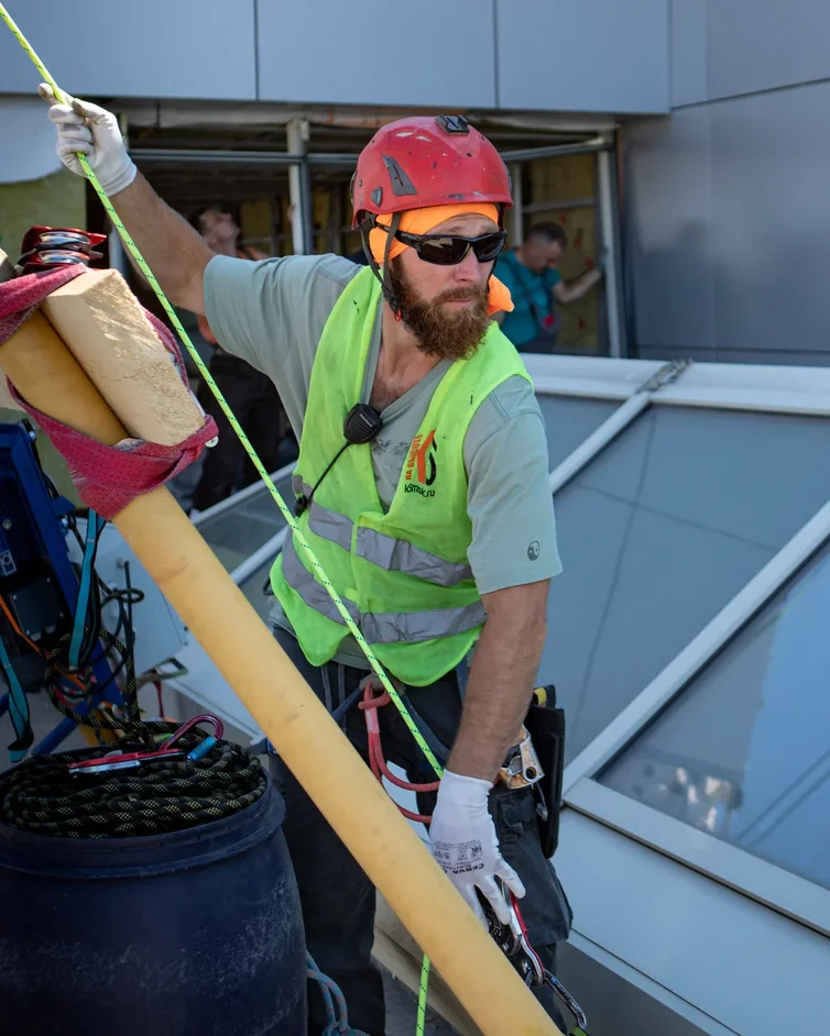 Вот он день подъема, монтаж грузоподъёмной линии, ее проверка и доработка заняла один день. На второй день с утра приехала фура с грузом, подъём 6 элементов прошел в штатном режиме, ровно, гладко, по запланированному ранее плану, за один день, в тот же день были разобраны и спущены все вспомогательные приспособления. Одним из элементов была рама со стеклопакетом была весом 700 килограммов и длинной 8 метров.